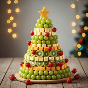 Add cherry tomatoes or strawberries as “ornaments” and a star-shaped piece of cheese at the top for decoration.