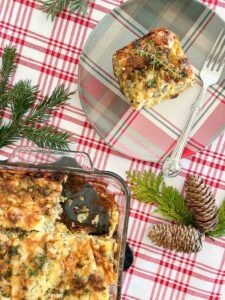 Let the casserole rest for 5–10 minutes before slicing. Serve warm with fresh fruit, orange juice, or coffee for a complete holiday breakfast.