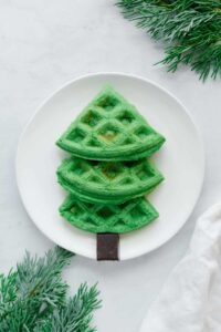 If your waffle maker doesn’t have a tree shape, simply cut triangular “tree” pieces from regular round waffles using a knife or cookie cutter.