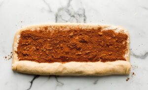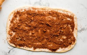 Spread the softened butter evenly, then sprinkle the cinnamon-sugar mixture over the dough.