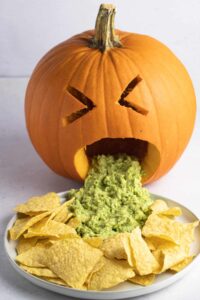 A carved pumpkin “vomits” guacamole or dip for a hilarious effect.
