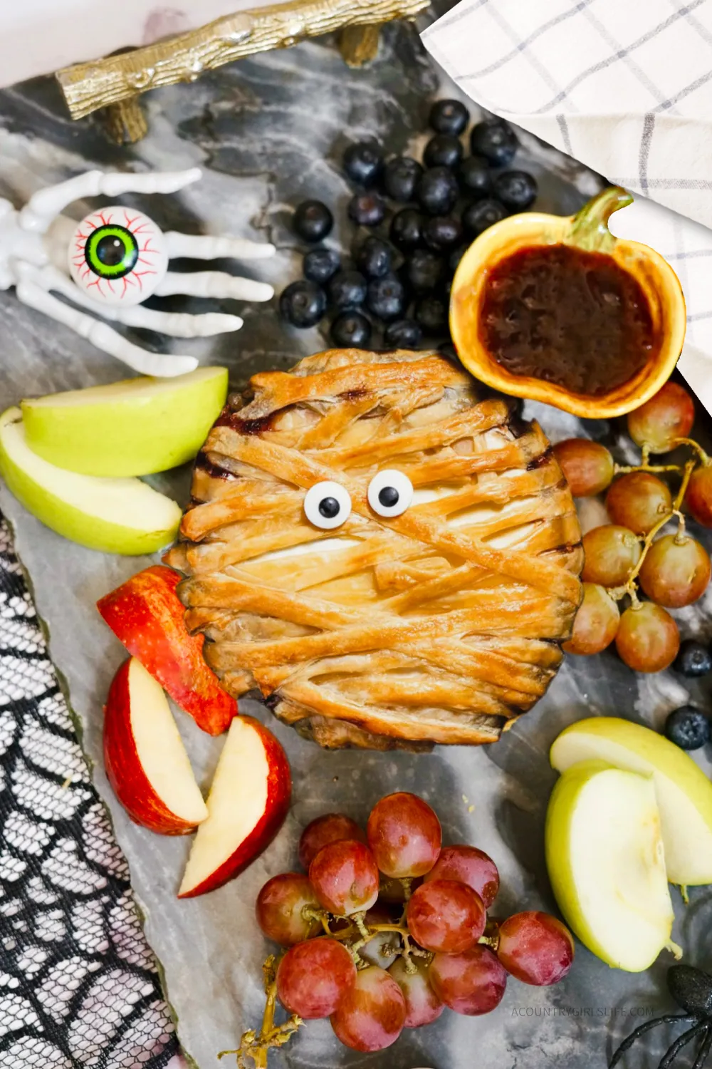 Create mummy strips: Cut the puff pastry into thin strips and wrap them around the brie, leaving small gaps to resemble mummy bandages.