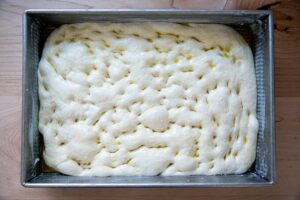 - Prepare the Pan: Coat a 9x13-inch pan generously with olive oil. Transfer dough to the pan and gently stretch it to fit. Let rise for 2–3 hours until puffy.