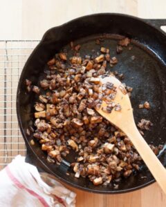 While the squash roasts, heat olive oil in a large skillet over medium heat. Add diced onion and garlic; cook until fragrant.