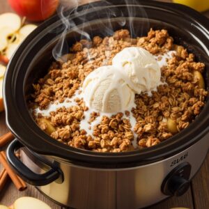 Warm, spiced apples with a buttery oat topping — the perfect easy dessert.