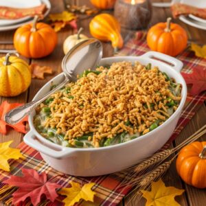 Creamy green beans topped with crispy fried onions—a Thanksgiving must-have.