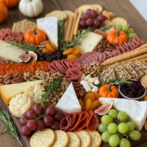 A Thanksgiving-themed charcuterie board is a great appetizer to bring if you want something elegant and easy.