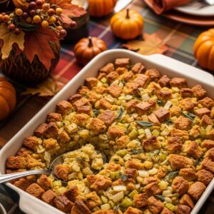 Made with cubed bread, onions, celery, herbs, and broth, it’s flavorful and satisfying.