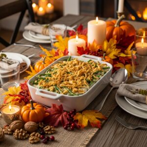 Made with green beans, cream of mushroom soup, and fried onions, it’s simple to prepare and easy to transport.